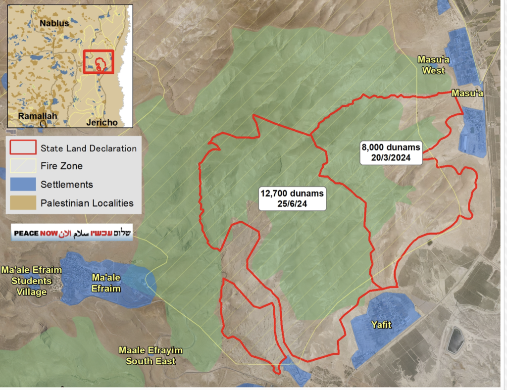 A significant part of the area that is been declared by Israel as “State Land” previously was defined as a: nature reserve and as a “fire area”, for military use. This announcement completes the Israeli takeover of this area imposed many restrictions on the Palestinians’ ability to use their lands. This declaration creates a territorial continuity between the settlements in the Jordan Valley (Yifit and Masu’a) and the settlements at the eastern end of the mountainside (Gitit and Ma’ale Efraim).
