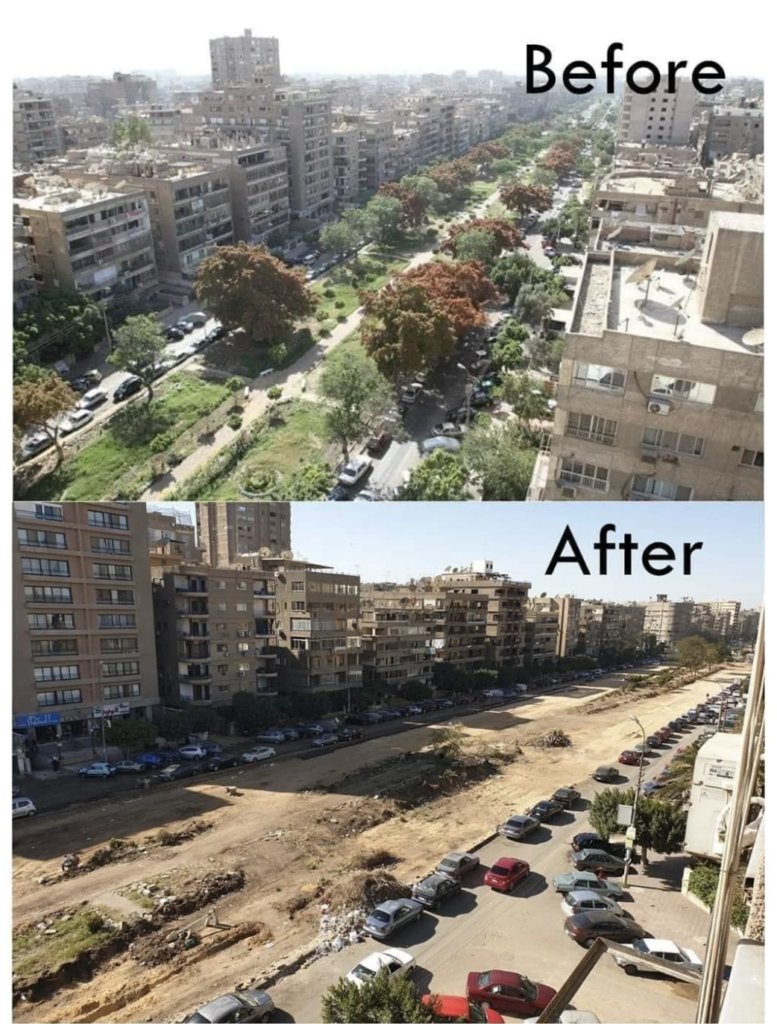 In addition to profit-driven urban expansion, Sisi’s regime has faced criticism for continuously cutting down trees from the country’s already limited green spaces, an act publicly described as a “green massacre.” According to Global Forest Watch, Egypt saw a reduction of approximately 5,060,000 square meters of green spaces and tree cover between 2013 and 2023.