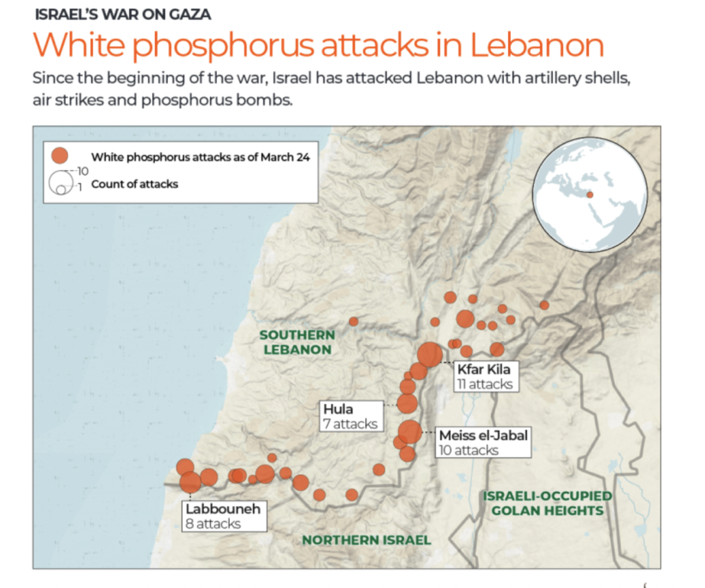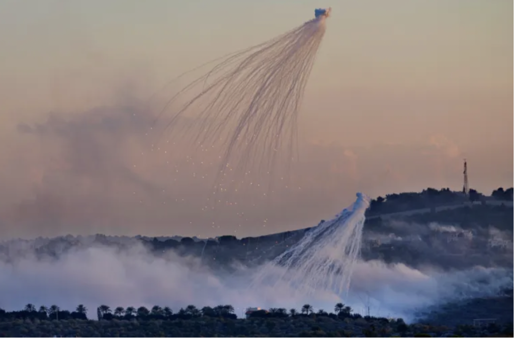 In October 2023, human rights groups like HRW and Amnesty International documented Israel’s use of white phosphorus in dense civilian areas in Gaza and farmlands and residential zones in south Lebanon.